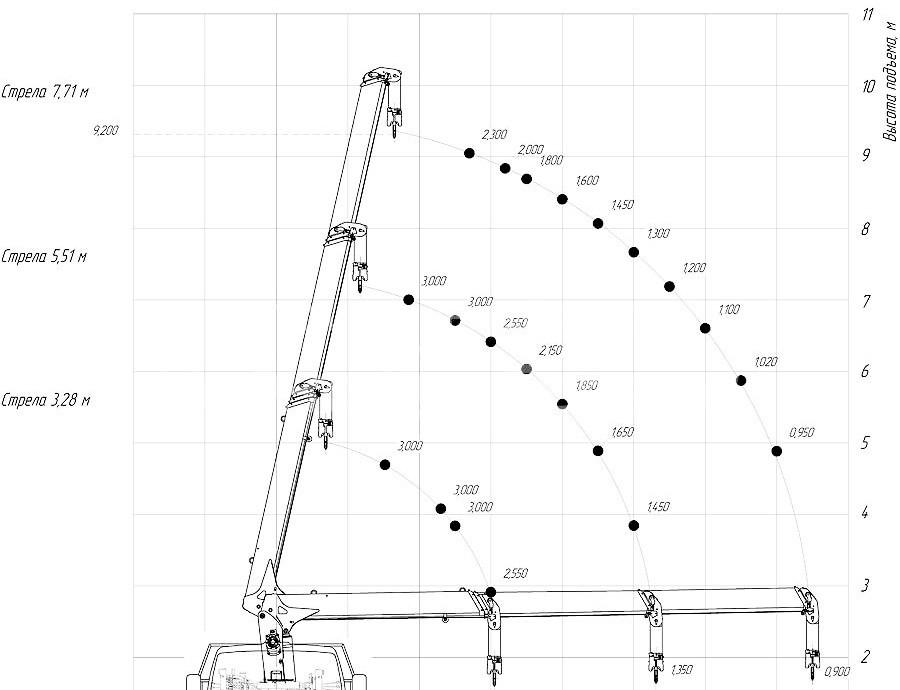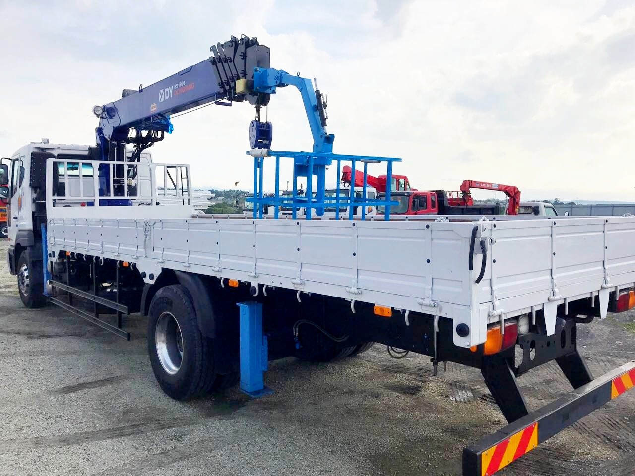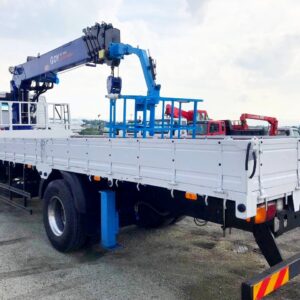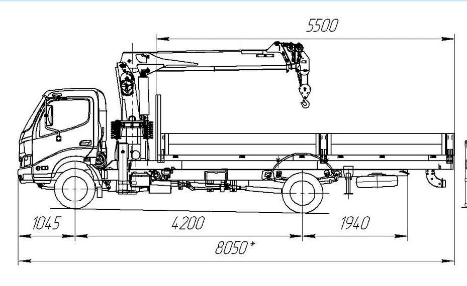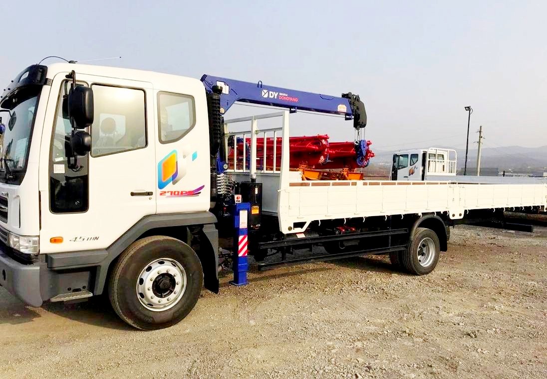 Кран-манипулятор выгодно отличается от громоздких неповоротливых собратьев. Это маневренная и легкая модель, прокат которой востребован для работ в ограниченном пространстве. Грузовик оснащен КМУ от корейского производителя Dongyang Mechatronics Corp. Подъемный механизм установлен на шасси Daewoo Novus.